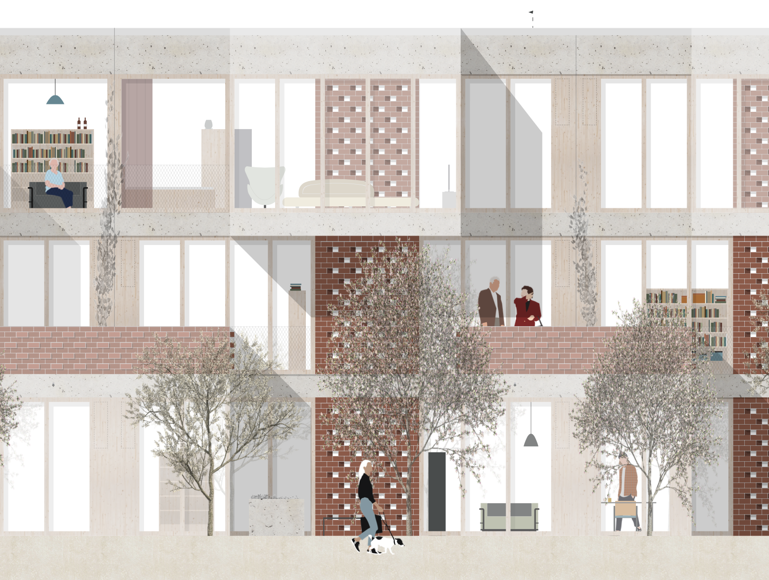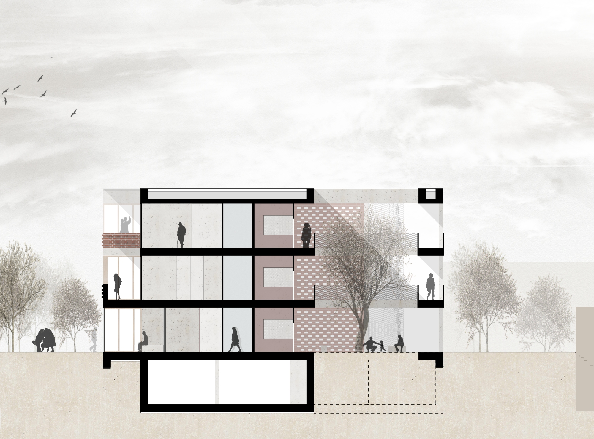 Das transparentes Gebäude dient vor allem zur Steigerung der innenraumbehafteten Kommunikation und einer sprachlosen Interaktionen zwischen Menschen. Die angelegten Erker auf der Südseite erhöhen die Sichtweite aus dem Innenraum und erlaubt den Bewohnenden an ihre Umgebung auch aus dem Innenraum teilzuhaben. Um die direkte Kommunikation innerhalb des Gebäudes zu erhöhen, wird nordseitig ein Laubengang als Primärerschliessung angelegt. Dieser wird vor jeder Wohnungseinheit ausgeweitet und als gemeinschaftlich nutzbarer Aufenthaltsort, aber auch als privat anzueignende Fläche angeboten. Die Frequentierung der Laubengänge wird durch östlich und westlich angesiedelte Gemeinschaftsräume gefördert.
